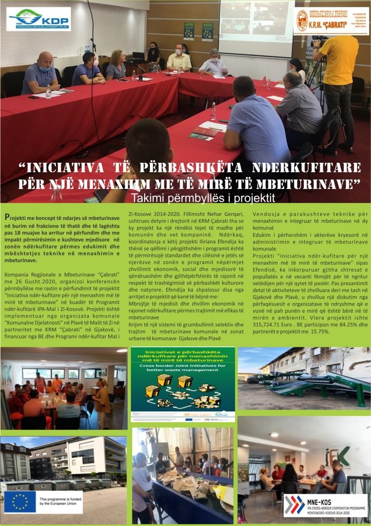 Kompania Regjionale e Mbeturinave “Çabrati” me 26 Gusht.2020, organizoi konferencën përmbyllëse me rastin e përfundimit të projektit “Iniciativa ndër-kufitare për një menaxhim më të mirë të mbeturinave” në kuadër të Programit ndër-kufitarë IPA-Mal i Zi-Kosovë. Projekti është implementuar nga organizata komunale “Komunalne Djelatnosti” në Plavë të Malit të Zi në partneritet me KRM “Çabrati” në Gjakovë, i financuar nga BE dhe Programi ndër-kufitar Mal i Zi-Kosove 2014-2020. Fillimisht Nehar Gerqari, ushtrues detyre i drejtorit në KRM Çabrati tha se ky projekt ka një rëndësi tejet të madhe për komunën dhe vet kompaninë. Ndërkaq, koordinatorja e këtij projekti Iliriana Efendija ka thënë se qëllimi i përgjithshëm i programit është të përmirësojë standardet dhe cilësinë e jetës së njerëzve në zonën e programit nëpërmjet zhvillimit ekonomik, social dhe mjedisorë të qëndrueshëm dhe gjithëpërfshirës të rajonit në respekt të trashëgimisë së përbashkët kulturore dhe natyrore. Efendija ka shpalosur disa nga arritjet e projektit që kanë të bëjnë me:
