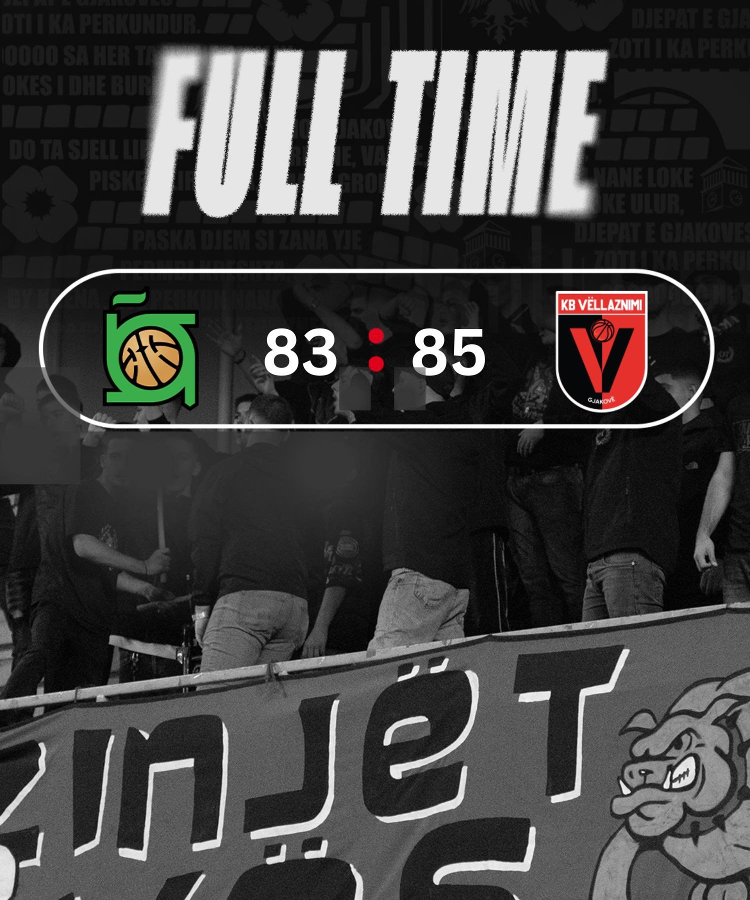 Pallati i sporteve në Gjakovë të dielen në mbrëmje përjetoj një spektakël të vërtetë të basketbollit. Tifozet  “Kuq e zi” gjatë gjithë ndeshjes e mbështeten skuadren e zemres ndërsa takimi nisi me këngën e Mitrovices, “Yjet e Gjakoves” dhe u mbyll me jehonën me thirrjet “Hellems, Hellems” në shenjë respekti për lojën e tij brilante.