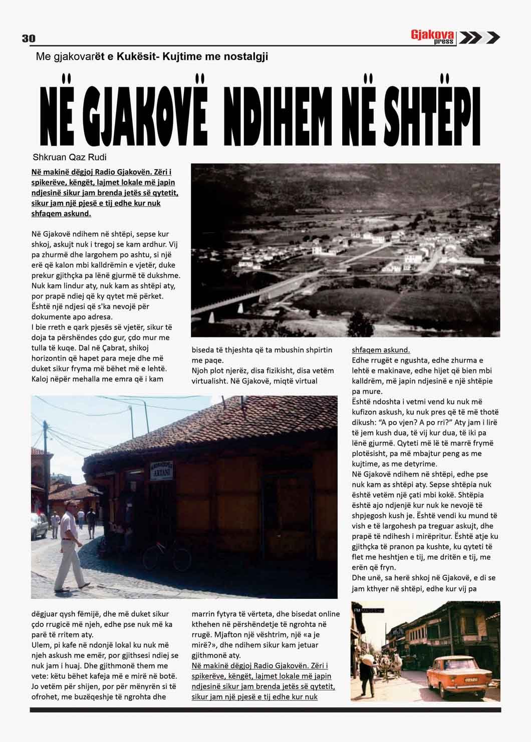 Në makinë dëgjoj Radio Gjakovën. Zëri i spikerëve, këngët, lajmet lokale më japin ndjesinë sikur jam brenda jetës së qytetit, sikur jam një pjesë e tij edhe kur nuk shfaqem askund…
