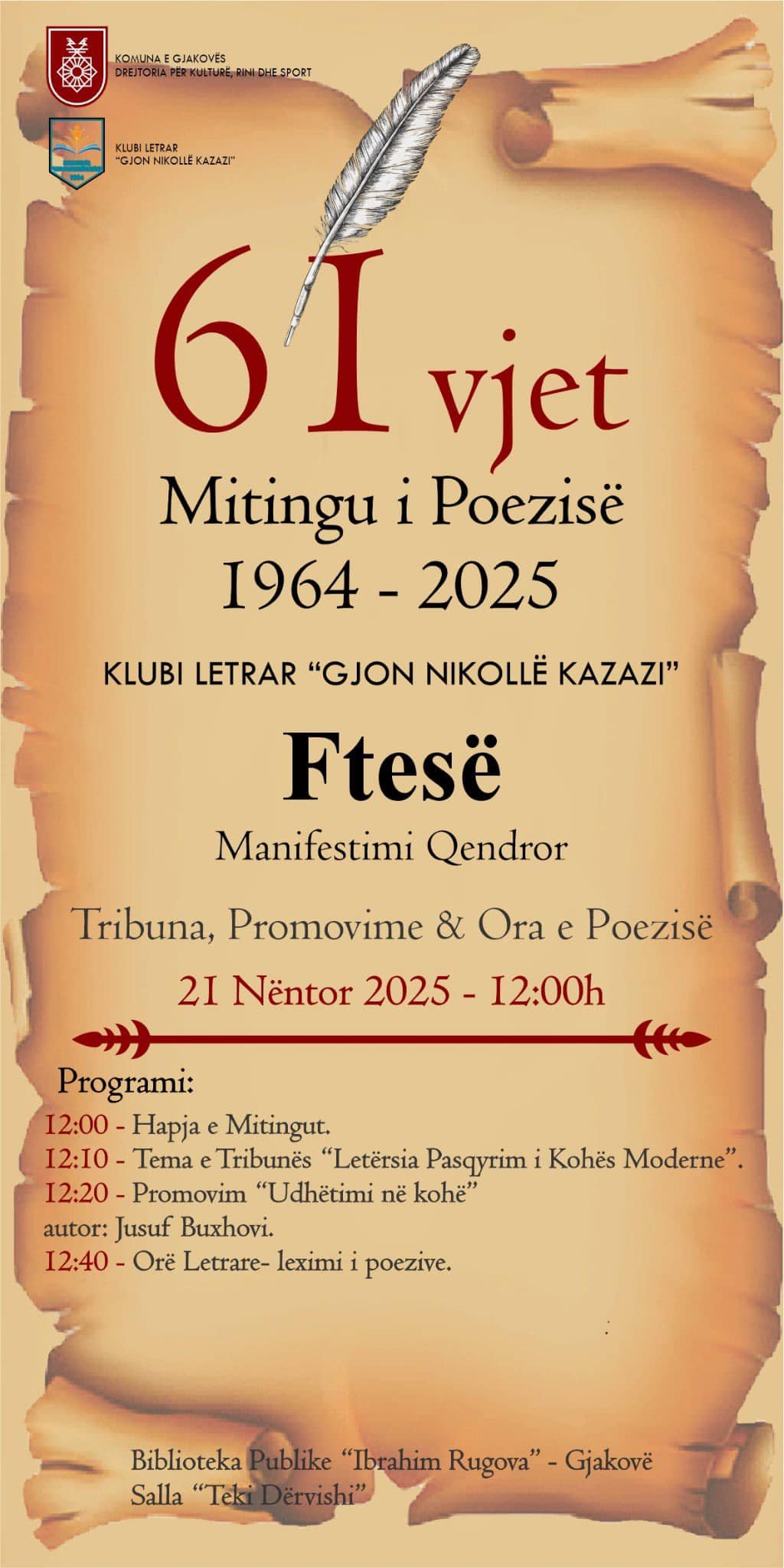 Pas 61 viteve , të premten më 21 Nëntor në Gjakovë mbahet edicioni i 61-të i Mitingut tradicional të Poezisë, manifestimi më i madh letrar në vënd, i cili mbahët me organizim të Klubit Letrar “Gjon Nikoll’ Kazazi. Hapja solemne e kësaj feste të fjalës së shkruar do të bëhët në ora 12.00 në sallën “Teki Dervishi” të Bibliotekës Rajonale në Gjakovë.