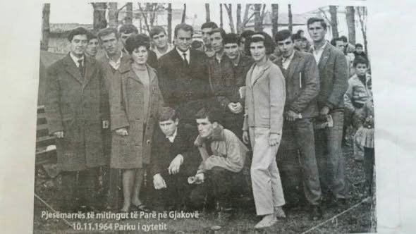 (Në foto, disa nga pjesëmarrësit e Mitingut të Parë të Poezisë në Gjakovë më 10.11.1964: Din Mehmeti, Enver Gjerqeku, Jusuf Buxhovi, Ali Olloni, Nexhmedin Soba, Hasan Hasani, Ganimete Vula, Mazllom Saneja, Bajram Rama …)