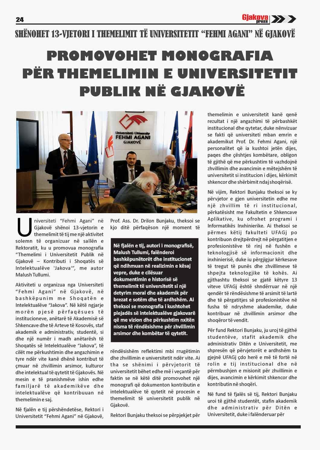 Gjakova rikujtoi një nga kapitujt më të rëndësishëm të jetës së saj arsimore dhe kulturore, duke shënuar 13-vjetorin e themelimit të Universitetit Publik “Fehmi Agani”. Në këtë përvjetor simbolik u promovua monografia “Themelimi i Universitetit Publik në Gjakovë – Kontributi i Shoqatës së Intelektualëve ‘Jakova’”, me autor Malush Tullumi, një vepër që dokumenton rrugëtimin e gjatë dhe përpjekjet e intelektualëve gjakovarë për krijimin e një institucioni të arsimit të lartë në këtë qytet me traditë të pasur kulturore.